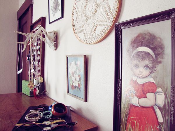 This is “in progress” because I am planning to paint the walls and strip the dark stain off of the floors soon as well as other things, but it makes it so much  more enjoyable to be in my room now that I have some of my favorite pieces hung.  So without further ado, here is my bedroom: